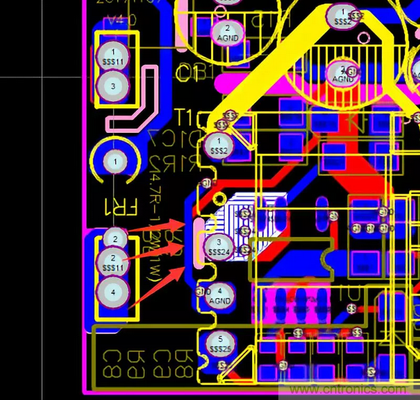 二:Y電容回路走線越短越好先經過變壓器地再回到大電容地,不與其它信號線交叉;