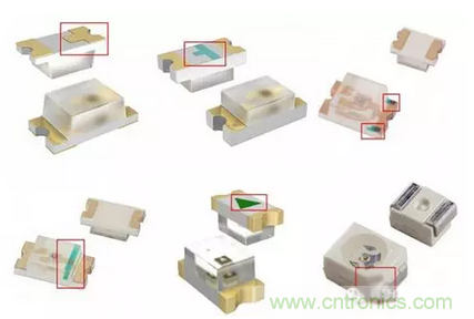 表面貼裝的發光二極管可以根據數據手冊的信息去判斷。幾乎所有表面貼裝的發光二極管都會有一個標記顯示極性,下圖是一些標記的例子。