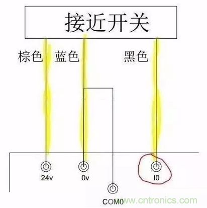 如圖三所示,這是PLC 的實際接線,黃色熒光筆標識的是接近開關的三根接線,棕色和藍色分別接到PLC 的24V和0V上,黑色接到I0上。當有物體到達接近開關的感應距離時,PLC的I0便會有輸入,我們在程序里就可以做處理。需要注意的是,圖中0V和COM0短接,因此,這種接法適合PNP型的接近開關。而NPN型的接近開關按此接法,是不會有任何信號的。接近開關的接線只和NPN,PNP類型有關和感性 容性無任何關系。