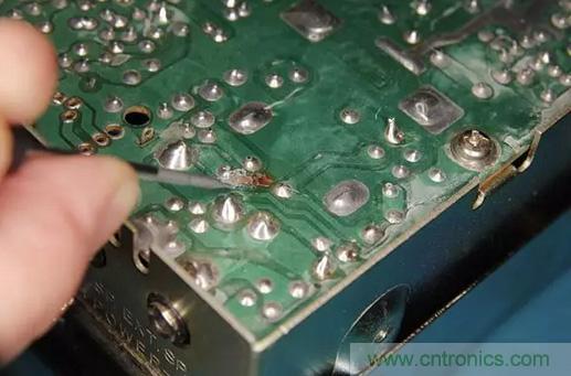 第一步是用小型精密螺絲刀(一字式) 把板上銅走線綠涂層去掉。輕輕刮掉走線上的綠漆涂層,露出銅層,如圖所示。