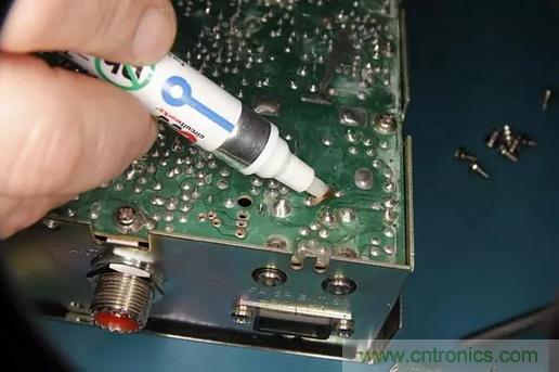 現在,用一些助焊劑來準備給銅點鍍錫(簡單地在銅焊點上刷一層薄焊料)