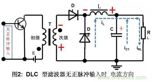 b. 輸入正脈沖消失,負載RL的電流由兩路提供,一路是C2放電提供的電流為-ic2,,另一路是由電感L儲存的磁能轉換成電能,并與C1上的電壓串聯后提供-ic1。負載RL中的電流等于兩個電容器放電電流的和,即IL= -(ic2+ic1)