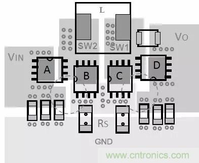 降壓Buck變換器的電感位于輸出回路,所以輸出回路的電流是連續的,輸入回路的電流是不連續的,輸入回路的干擾大,這些環路產生很大的磁場發射,因此輸入回路要盡可能的小。輸入回路的地為功率地,要與系統的信號地分開單獨布線,輸出地可以作為干凈的信號地。