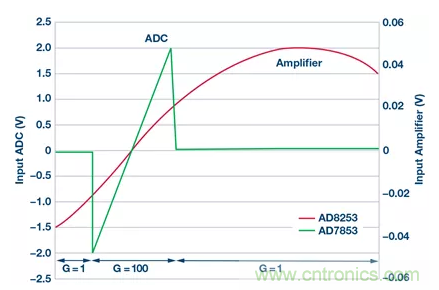 除模擬路徑中的組件外,F(xiàn)PGA(或處理器)對(duì)電路性能也很重要。關(guān)鍵任務(wù)是將儀表放大器的增益從1切換為100。為此,對(duì)許多閾值進(jìn)行了編程以確保ADC不飽和。因此,AD8253在輸入電壓高達(dá)20mV左右時(shí)以100為增益運(yùn)行,這使得ADC輸入端的最大電壓達(dá)2.0V。然后,F(xiàn)PGA將AD8253的增益降至1且沒有延遲,以防止過載(見圖3)。