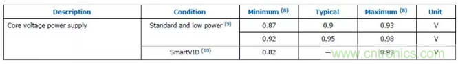 圖1:Arria 10 FPGA內核電壓要求 (來源: Intel®Arria® 10 器件數據表)