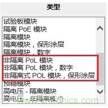 為方便工程師選料,Digi-Key官網上的「電源 - 板安裝」分類中的「直流轉換器」子分類中,在「類型」中已將PoL產品列出,方便工程師更快更準確地選料。