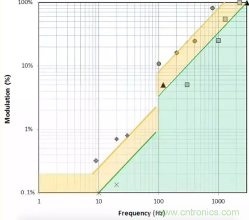 電氣和電子工程師協會1789-2015年標準首次提出降低人體健康風險的全面建議。上圖顯示的是對人體健康風險較低或無明顯風險(綠色部分)的整個頻率范圍內的頻閃限值曲線。