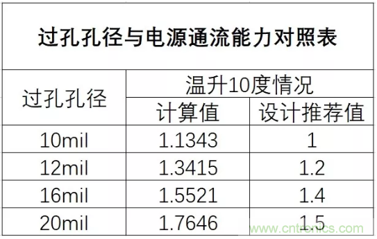換層時孔的大小及數目是否滿足電源電流通流能力。首先要了解單個過孔的通流能力,在常規情況下,溫升為10度,可參考下表。