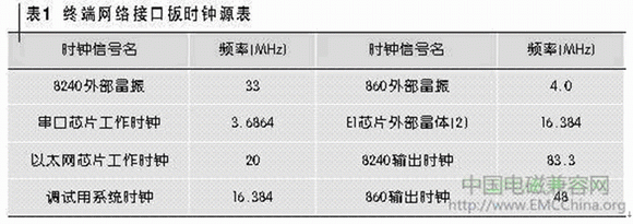 因為終端網絡接口板上沒有412.5 MHz和577.5 MHz這兩個頻率信號,所以懷疑這兩個頻點可能是某些頻率信號的諧波分量。高速電路中,時鐘電流是第一輻射源。筆者對終端網絡接口板上的各時鐘信號進行了統計,如表1所示。