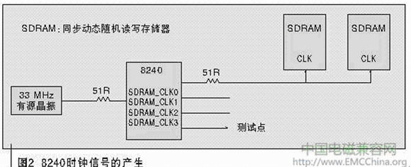 圖2所示為8240時鐘信號的產生原理圖。8240外部有源晶振產生33 MHz的振蕩頻率,送入8240芯片,經內部PLL(鎖相環)鎖相倍頻,輸出83.3 MHz頻率,作為SDRAM(同步動態隨機讀寫存儲器)的工作時鐘,8240有4個引腳可以同時送出該83.3 MHz的時鐘:SDRAM_CLK0~SDRAM_CLK3,而且可以在8240內部寄存器中設置開關。該單板在電路設計時,使用SDRAM_CLK0作為SDRAM工作時鐘,另一路SDRAM_CLK3送至一測試點,方便調試時測量時鐘信號,其余2路設置為關閉狀態,不對外輸出時鐘。