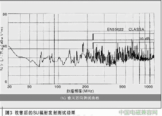 筆者用高速示波器測量出網絡接口板的工作地噪聲(Vp-p)為96 mV,中頻板工作后,噪聲增至130 mV以上。此測量方法可能存在偏差,但總體的趨勢是2塊單板同時工作后,的確增加了地線噪聲,對EMI有一定的影響,只不過影響是有限的。