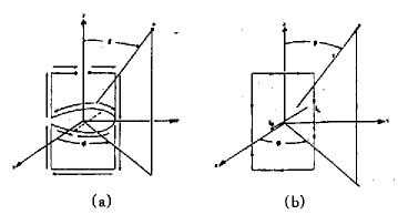 如圖2(a)所示。此處我們選擇螺旋中心為原點,螺旋軸為Z軸,頂面和底面上天線臂的平行線為Y軸來建立坐標系,另外柱面上的螺旋部分近似用直線和半圓的組合來代替,圖中的實箭頭表示電流方向,虛箭頭表示圓上電流的矢量和。顯然該模型可更進一步簡化為圖2(b)所示的一個YZ平面上的電流環和一個X軸上的電偶極子的組合。同樣跟它垂直的另一付雙臂螺旋天線亦可等效成一個XZ平面上的電流環和一個Y軸上的電偶極子的組合。根據天線的基本原理,由于這兩組電流環和電偶極子互相垂直且相差90°,那么在遠區得到的是一個寬波束的心臟形圓極化方向圖。