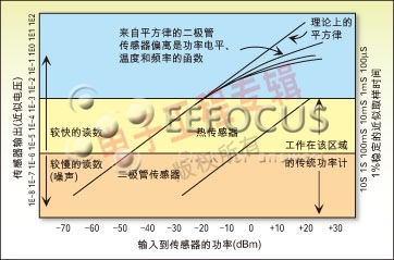 圖2所示為熱電堆單元和二極管檢測器的響應。傳統的二極管檢測器要么工作在平方律區域,因此動態范圍被限制為50dB;要么采用線性校正技術來擴展它們的動態范圍。這種技術受到功率計速度的限制,并且不適合于系統傳輸的符號率遠遠超過功率計采樣率的應用。