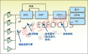 這是一個現代功率計的典型方框圖。輸入信號被放大后,經過模數轉換,然后,由DSP處理。在傳統的功率計中,放大器的每一個量程的設置通常采用十倍量程。對寬動態范圍功率傳感器的需求已經導致要采用動態范圍更大的模數轉換器,并且各量程的覆蓋范圍通常大于10dB。