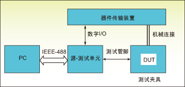 我們的第一個例子包括測試儀器、器件傳遞裝置(handler)和PC(圖1),這里需要注意如何通過內部編程來消除大多數的GPIB通訊來加速測試。