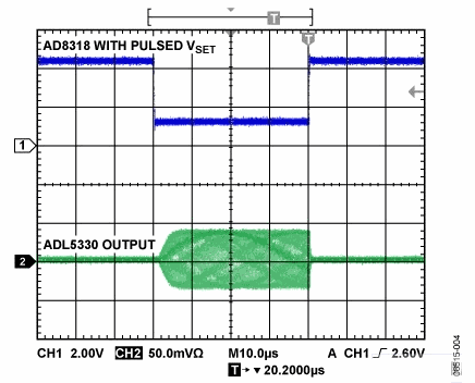 圖4顯示AGC RF輸出對VSET脈沖的響應。當VSET降至1 V時,AGC環路以RF突發脈沖予以響應。響應時間和信號積分量由AD8318 CFLT引腳上的電容控制,這與積分放大器周圍的反饋電容類似。電容增加將導致響應速度變慢。