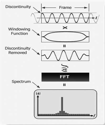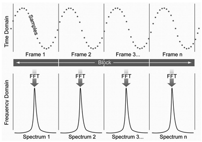 上一層是幀,幀由整數(shù)個連續(xù)樣點組成,是可以應用快速傅立葉變換(FFT)把時域數(shù)據(jù)轉換到頻域中的基本單位。在這一過程中,每個幀產生一個頻域頻譜。