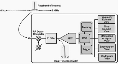 在實時頻譜儀實時測量模式下,它無縫捕獲每個塊并存儲在內存中。然后它使用DSP技術進行后期處理,分析信號的頻率、時間和調制特點。