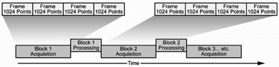 圖5是塊采集模式,可以實現(xiàn)實時無縫捕獲。對塊內部的所有幀,每個采集在時間上都是無縫的。在一個采集塊中的信號處理完成后,將開始采集下一個塊。塊存儲在內存中,可以應用任何實時測量。例如,實時頻譜模式下捕獲的信號可以在解調模式和時間模式下分析。
