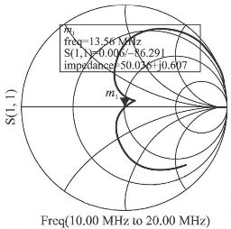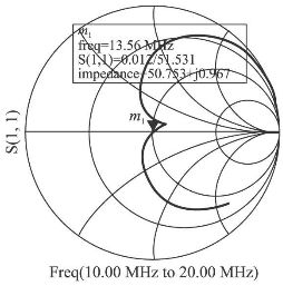 手動調諧即是交替不斷調整電容C1、C2 的值,同時觀察曲線變化,直到在所要求的頻率點S11等于0。圖2為某一天線電路在頻率在10~20MHz之間變化時,其反射系數的變化曲線,其中,標記13. 56MHz的點, S11值近似為0,達到了匹配要求。