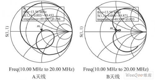 結果如圖7所示,對于A, B兩種天線的任何一種,都找到了最優C1 和C2 的組合。當頻率為13. 56MHz時,兩類天線的反射系數雖然與0點都有一定的偏差,但其偏差都在可接受范圍之內。