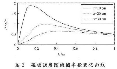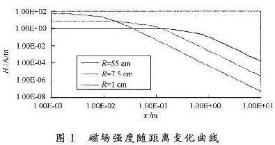 在與發(fā)射天線的距離x為常數(shù)并簡單地假定發(fā)射天線線圈中電流I不變的情況下,如果改變發(fā)送天線的半徑R時,就可以根據(jù)距離x與天線半徑R之間的關(guān)系得到最大的磁場強(qiáng)度H.這意味著:對于每種射頻識別系統(tǒng)的閱讀器作用距離都對應(yīng)有一個最佳的天線半徑R.如果選擇的天線半徑過大,那么在與發(fā)射天線的距離x=0處,磁場強(qiáng)度是很小的;相反,如果天線半徑的選擇太小,那么其磁場強(qiáng)度則以z的三次方的比例衰減,如圖2所示。