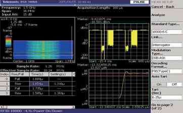 政府規定要求控制發射信號的功率、頻率、帶寬。這些規定防止有害干擾并保證每個發射者都是頻帶內其他用戶的友好鄰居。對于許多頻譜分析儀特別是通常用于脈沖信號能量測量的掃頻頻譜分析儀,進行此類測量是具有挑戰性的。RTSA 能夠分析一個完整的分組發射過程的能量特點,也能直接測量跳頻信號的載波頻率,而無需將信號置于一個跨度的中心。按一下按鍵,分析儀就能識別一個瞬時 RFID 信號的調制方式并能夠對功率、頻率和帶寬進行監管測量,使預一致性(pre-compliance)測試過程變得非常靈活和方便 [參閱圖2]。預一致性測試有助于確保產品一次通過一致性測試,而無需重新設計和重新測試。