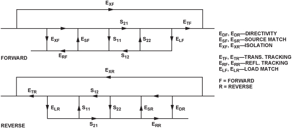 圖4顯示了雙端口系統的完整12項誤差模型及其系統性影響和誤差源。測量頻率范圍會影響校準選擇:頻率越高,則校準誤差越大。隨著更多誤差項變得顯著,必須更換校準技術以適應高頻影響。