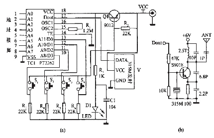 該部分電路主要由315MHz無線數(shù)據(jù)發(fā)射模塊和編碼集成PT2262組成。該無線發(fā)射模塊原理圖如圖1中(b)所示,它具有較寬的工作電壓范圍3-12V,當電壓變化時發(fā)射頻率基本不變,和發(fā)射模塊配套的接收模塊無需任何調(diào)整就能穩(wěn)定地接收。當發(fā)射電壓為3V時,空曠地傳輸距離約20-50m,發(fā)射功率較小;當電壓5V時約100-200m)當電壓9V時約300-500m;當發(fā)射電壓為12V時,為最佳工作電壓,具有較好的發(fā)射效果,發(fā)射電流約60毫安,空曠地傳輸距離700-800m,發(fā)射功率約500mW.當電壓大于12V時功耗增大,有效發(fā)射功率不再明顯提高。發(fā)射模塊采用ASK方式調(diào)制,以降低功耗。當數(shù)據(jù)信號停止時發(fā)射電流降為零,數(shù)據(jù)信號與DF發(fā)射模塊輸入端可以用電阻或者直接連接而不能用電容耦合,否則DF發(fā)射模塊將不能正常工作。數(shù)據(jù)電平應接近DF數(shù)據(jù)模塊的實際工作電壓,以獲得較高的調(diào)制效果。