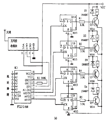 所以輸出接口在未解碼時就為低電平輸出了,即為非鏤狀態(tài)。所以如果將蠶2(a)中酶PT2272--M4改為Pr2272~L4,相應的將原理網(wǎng)圖2(a)改為圖3,也能實現(xiàn)同樣的功能,即四路非鎖狀態(tài)。如果將某一路改為蠢錟狀態(tài),將耀應的二極管去掉幫霹。鍘如,去掉D5,就將PT2272--L4的第13腳的非自鎖定輸出改為錟定輸出。