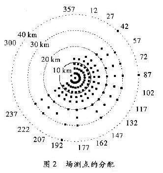 覆蓋測試是根據特定的半徑和幅角在圓周上進行選點的,這些測試點的選擇總共包含18個不同幅角(12,27,42,58,72,87,102,117,132,147,162,177,182,207,222,287,300,357),對應于以發射機為圓心的3,6,9,12,15,20,25,30和40 km這幾個半徑上。選點是出于幅角的考慮,展現了至少45 dBμV/m內的場強估計,并根據地形信息通過算法得到有用信息。圖2展示了場測選點的地形分配,測試點的具體參數,如表2所示。