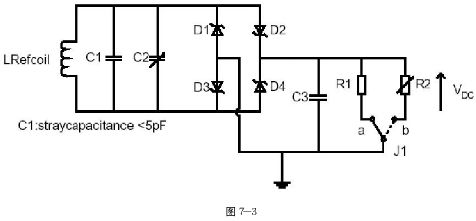 (2)被動模式接收:此為測試發起設備可以正確的接收被動目標物所回傳的信號。利用圖7-2的loadmodulation測試線路所做成的referencedevice,先將對應C3電壓與距離的關系以圖8的架構校正好,之后即可將此卡與發起設備的待測物做量測,測試由referencedevice所發出的調變信號于待測物端的接收情況。在此只能對部分的測試項目做討論而詳細的測試請參考ECMA。