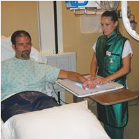 佛羅里達州那不勒斯NCH醫療保健系統放射實習生正在展示便攜式X光機的無線DR成像板能夠根據需要進行最優的調整