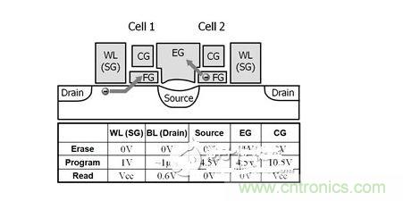 1 第3代SuperFlash存儲單元的結構和典型工作條件。圖中給出了兩個共用源極和擦除柵極的單元。圖中用箭頭指示燒寫(單元1)和擦除(單元2)期間的電子轉移情況。WL為字線(選擇柵極),CG為耦合柵極,EG為擦除柵極,FG為浮置柵極。