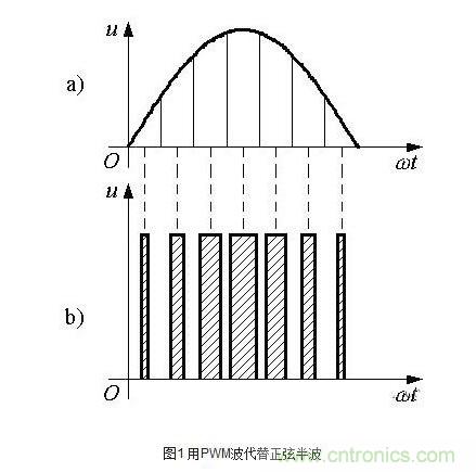 如圖1 所示,用一系列等幅不等寬的脈沖來代替一個正弦半波,正弦半波N 等分,看成N 個相連的脈沖序列,寬度相等,但幅值不等;用矩形脈沖代替,等幅,不等寬,中點重合,面積(沖量)相等,寬度按正弦規律變化。