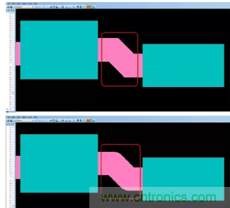 射頻和微波電路中經常用到倒角,以減小供給線與電容之間的分段不連續性阻抗,從而改善 MMIC 的頻率性能。90º拐角與倒角之間的距離至關重要。因此,設計人員需要采用自動方法來基于設計指定需要產生的倒角比率。PCB設計工具如果能夠基于設計規則自動強制實施需要產生的倒角比率,設計人員和工程師將會從中受益,在節省時間的同時提高設計質量(圖 3)。