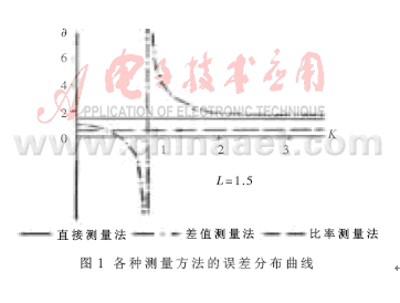 圖1表示取L=1.5時相對誤差隨元件值的分布情況。可以看出,比率測量法在很寬的測量范圍內(nèi)均具有良好的抗干擾能力。當(dāng)存在多個影響因素或者在分析由上述方法組合成的測量裝置時,可根據(jù)疊加原理按系統(tǒng)誤差的理論綜合評定其精度。