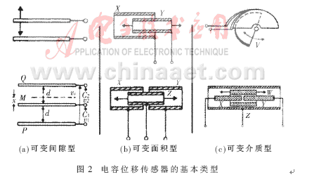 電容位移傳感器的三種基本類型如圖2所示。其具體結(jié)構(gòu)可視實(shí)際運(yùn)用的場合靈活多變,電容極板可以是平面的或者球面的;運(yùn)動電極可以采用水銀等導(dǎo)電液體。圖2所示的三種基本類型均可組成差動式結(jié)構(gòu),如各分類中下部圖形所示。采用差動式結(jié)構(gòu)能夠提高傳感器線路的輸出靈敏度,減小非線性,還能在一定程度上抑制由靜電吸引帶來的誤差。當(dāng)要求測量系統(tǒng)具有很高的分辨力時,一般是保持極板面積相對固定而使電容傳感器極板間隙隨被測位移改變,即如圖2(a)所示的結(jié)構(gòu)。反之,采用保持間隙恒定而讓極板相對面積可變的結(jié)構(gòu),則可以在相當(dāng)大的動態(tài)范圍內(nèi)獲得線性的響應(yīng)[1]。