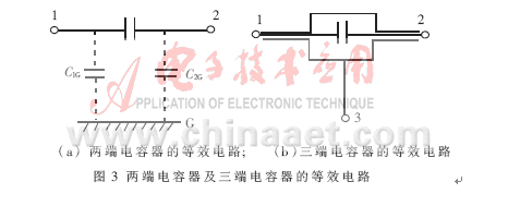 一般情況下,電阻、電感和電容等電子元件均被看作雙端元件。兩端電容器的等效電路示如圖3(a)。由于各端鈕對附近導(dǎo)電物體的分布電容C1G、C2G是變化的,