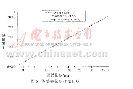 從最后獲得的極板位移與比率變壓器讀數(shù)的關(guān)系式(6)可知,讀數(shù)隨中心電極的位移呈線性變化。實(shí)際完成的系統(tǒng)由于結(jié)構(gòu)的不完善性,在接近量程的兩端會出現(xiàn)一定程度的非線性,如果采取等電位屏蔽等措施,可以把輸出特性的非線性降低到可以忽略的程度。可見,將差動式電容位移傳感器與比率測量方法結(jié)合起來,設(shè)計(jì)的測量系統(tǒng)既有很高的分辨能力及較強(qiáng)的抗干擾能力,也能夠獲得很好的線性響應(yīng)。
