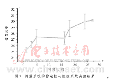 擬合方程顯示在圖中上部的方框里。從實(shí)驗(yàn)結(jié)果可看出,一微米位移可獲得變壓器電橋讀數(shù),變化為127.02,輸出特性的非線性誤差小于0.15%F.S.。比率臂第五檔變化一個數(shù)對應(yīng)的位移量根據(jù)傳感器結(jié)構(gòu)的不同,一般在5~8納米之間,末級的數(shù)據(jù)采集器可獲得300多毫伏的輸出,從數(shù)據(jù)采集器便能夠分辨出0.02納米的變化。在實(shí)驗(yàn)室環(huán)境下,傳感器測值隨著溫度的變化會產(chǎn)生極大的漂移,用標(biāo)準(zhǔn)元件來檢查變壓器電橋測量系統(tǒng)的溫度系數(shù)與穩(wěn)定性,所得結(jié)果見圖7。在28小時的實(shí)驗(yàn)期間測值等效變化僅為0.1納米,環(huán)境溫度變化為3~4℃。作者還曾將差動電容式位移傳感器放到100米深的鉆井底部,那里溫度的年變化不到0.03℃,整個位移測量系統(tǒng)月漂 移率僅為0.1納米[3]。