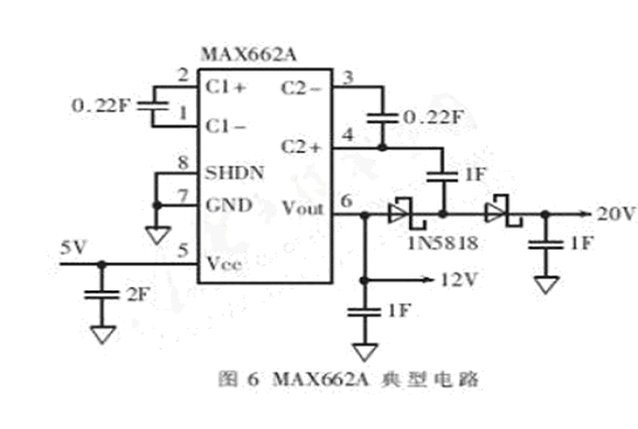 在HMC1055芯片上,置位/復位片的引腳名稱是S/R+和S/R-,沒有極性的區(qū)別,單個置位/復位帶標準阻值為2.0Ω,所以對于三軸系統(tǒng),三個金屬片串聯(lián)阻值為6.0Ω,則產(chǎn)生一個3~4A的最小脈沖驅(qū)動一個6Ω的負載所需的供電電壓為18V~24V。由于系統(tǒng)芯片都是使用5V電源,所以需要將5V電壓升壓到20V左右,可以使用MAX662來完成。典型的電路如圖6所示。