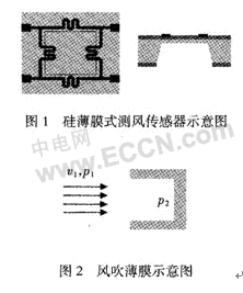 硅薄膜式測風(fēng)傳感器的設(shè)計(jì)示意圖如圖1所示。薄膜式風(fēng)速風(fēng)向傳感器主要是利用風(fēng)吹薄膜對(duì)薄膜產(chǎn)生風(fēng)壓,風(fēng)壓導(dǎo)致薄膜形變,薄膜上的應(yīng)變電阻就會(huì)感應(yīng)到薄膜的形變。通過測量應(yīng)變電阻的變化即可解算出風(fēng)速大小。設(shè)定測量時(shí)風(fēng)正面吹向薄膜如圖2所示。