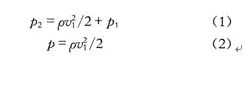 圖2中:υ1表示風(fēng)的平均流速;p1表示風(fēng)流的壓力;p2表示薄膜所受的壓力,應(yīng)用流體力學(xué)中理想伯努力方程如式(1)。其中p為空氣的密度,化簡后可以得出薄膜承受絕對(duì)壓強(qiáng)p的變化與風(fēng)速的關(guān)系如式(2),即