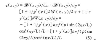 p是作用在膜上的絕對(duì)壓強(qiáng);E和υ分別為薄膜材料的楊氏模量和泊松比。材料的形變定義為單位長度材料的變化。設(shè)ε(x,y)是薄膜的應(yīng)變函數(shù),可以用式(5)來計(jì)算,則