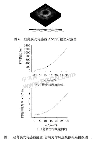 為了方便軟件模擬,簡化了所設(shè)計(jì)傳感器的模型。薄膜的厚度取10μm,2000 μm×2000μm的正方形,空腔的厚度取330μm。圖4為帶有薄膜形變的ANSYS模型。薄膜的模型用Solid45,流體模型應(yīng)用FLUID142,風(fēng)速從0~30 m/s間隔變化。通過模擬得到了薄膜最大形變、最大應(yīng)力與風(fēng)速的關(guān)系曲線,見圖5。分析模擬所得的數(shù)據(jù),可知薄膜撓度和剪切力都與風(fēng)速成二次關(guān)系,與薄膜式傳感器的理論分析相一致。