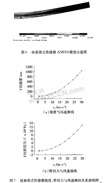 把模擬所得的數(shù)據(jù)進(jìn)行分析,可知懸梁撓度、剪圖7切力都與風(fēng)速成二次關(guān)系,與懸梁式傳感器理論分析相一致。