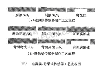兩種傳感器擬采用基于MEMS的體硅工藝,應(yīng)用正背面異向濕法刻蝕和背面深刻蝕形成薄膜或懸梁。薄膜設(shè)計(jì)為10μm厚,200 μm×2000 μm的正方形;懸梁設(shè)計(jì)為10μm厚,1500 μm長,500 μm寬。采用雙面拋光n型(76 mm)100硅片厚度350 μm。硅片清洗后,用熱氧化工藝制作一層氧化硅,再用LPCVD工藝制作一層氮化硅;之后濺射Pt電極,采用lift-off工藝去掉不需要的Pt金屬。完成以上步驟后,薄膜式傳感器直接在背面腐蝕形成薄膜,完成傳感器的制作;懸梁式傳感器需要先在正面腐蝕出10μm的深坑,后在背面先濕法腐蝕5 h深度達(dá)到200μm,再深刻蝕直到出現(xiàn)圖形。其過程如圖8。