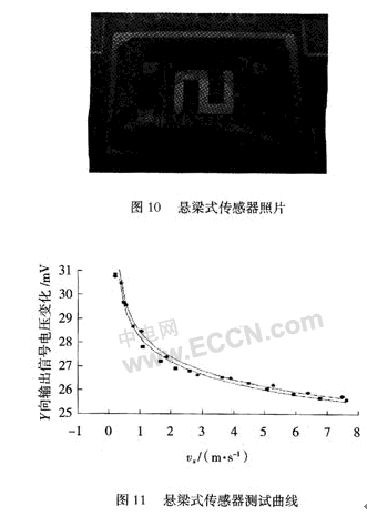 依據(jù)所設(shè)計(jì)的原理及工藝流程,首先制作了懸梁式測風(fēng)傳感器如圖10所示。傳感器為雙懸梁結(jié)構(gòu),通過惠斯通電橋輸出傳感器測量信號(hào),其測試圖如圖11所示。