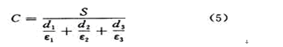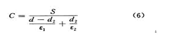 顯然,在電容器極板的遮蓋面積S,兩極板之間的距離d,被測物體上下側至電極之間介質的介電常數ε1和ε3確定時,電容量的大小就和被測材料的厚度d2及介電常數ε2有關。如被測材料介電常數ε2已知,就可以測量等厚教材料的厚度d2;或者被測材料的厚度d2已知,就可測量其介電常數ε2。這就是電容式測厚儀和電容式介電常數測量儀的工作原理。